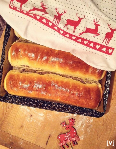 A pihentetés után a tésztából 4 cipót formázunk és kb. ½ cm vastag téglalapot nyújtunk belőle, egyenként. Az első tésztát megkenjük a diós töltelék felével egészen a tészta széléig – minden szélétől elhagyun kb. 1-1 centit. A rövidebbik végét visszahajtjuk, hogy ne folyjon ki a töltelék, majd a hosszabbik végétől kezdve feltekerjük.