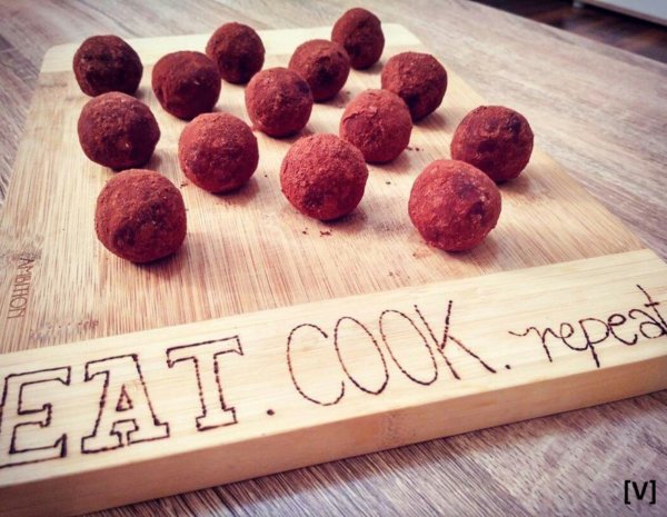 Egy külön tálkában összekeverünk kakaót, porcukrot, valamint őrölt kávét, és ebbe forgatjuk bele a masszából nyert diónyi nagyságú golyóinkat.