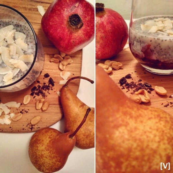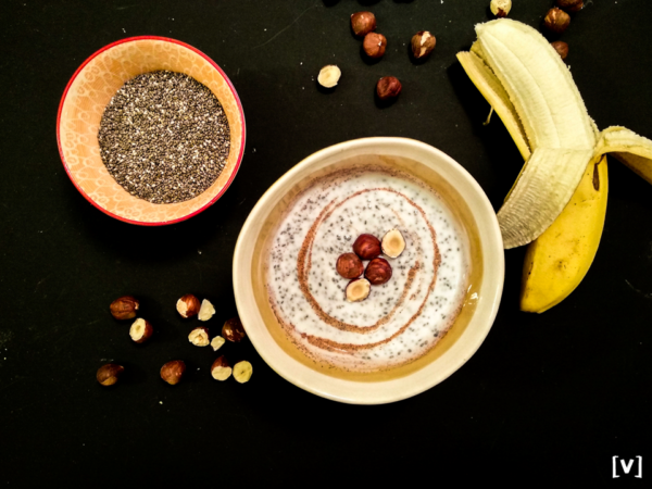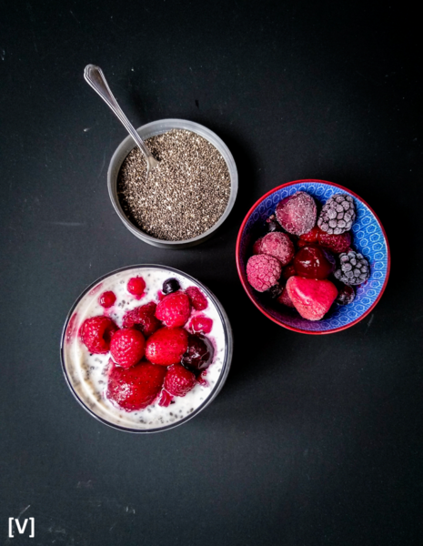 Ha késznek ítéljük a pürénket, megvárjuk míg kicsit kihűl, majd a chia magos joghurtos keverék tetejére kanalazzuk.