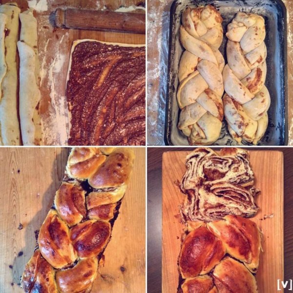 A megkent téglalap hosszabbik felétől kezdve elkezdjük szorosan feltekerni, így kapunk 3 rudat, amit szépen összefonunk. Ha ez megvan, egy kivajazott + kilisztezett kenyérsütő (püspökkenyér) formába tesszük, majd konyharuhával letakarva tovább kelesztjük (kb. fél órát).