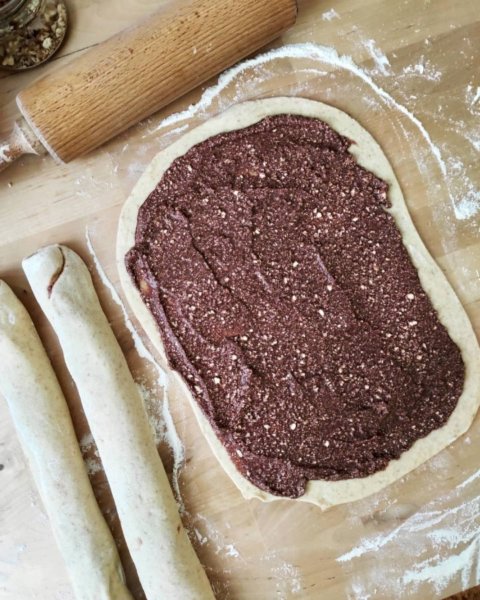 Ha a tészta duplájára kelt, három egyenlő részre osztjuk, majd egyesével kinyújtjuk téglalap alakúra [kb. 3 mm vastagra], majd mindegyiket megkenjük a töltelékkel.
