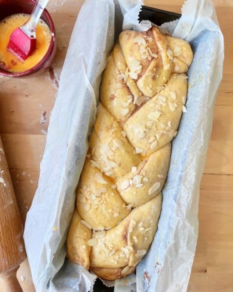 Ha szépen megkelt, lekenjünk egy felvert tojással, megszórjuk szeletelt mandulával, és 160 fokon kb. 30 perc alatt megsütjük.